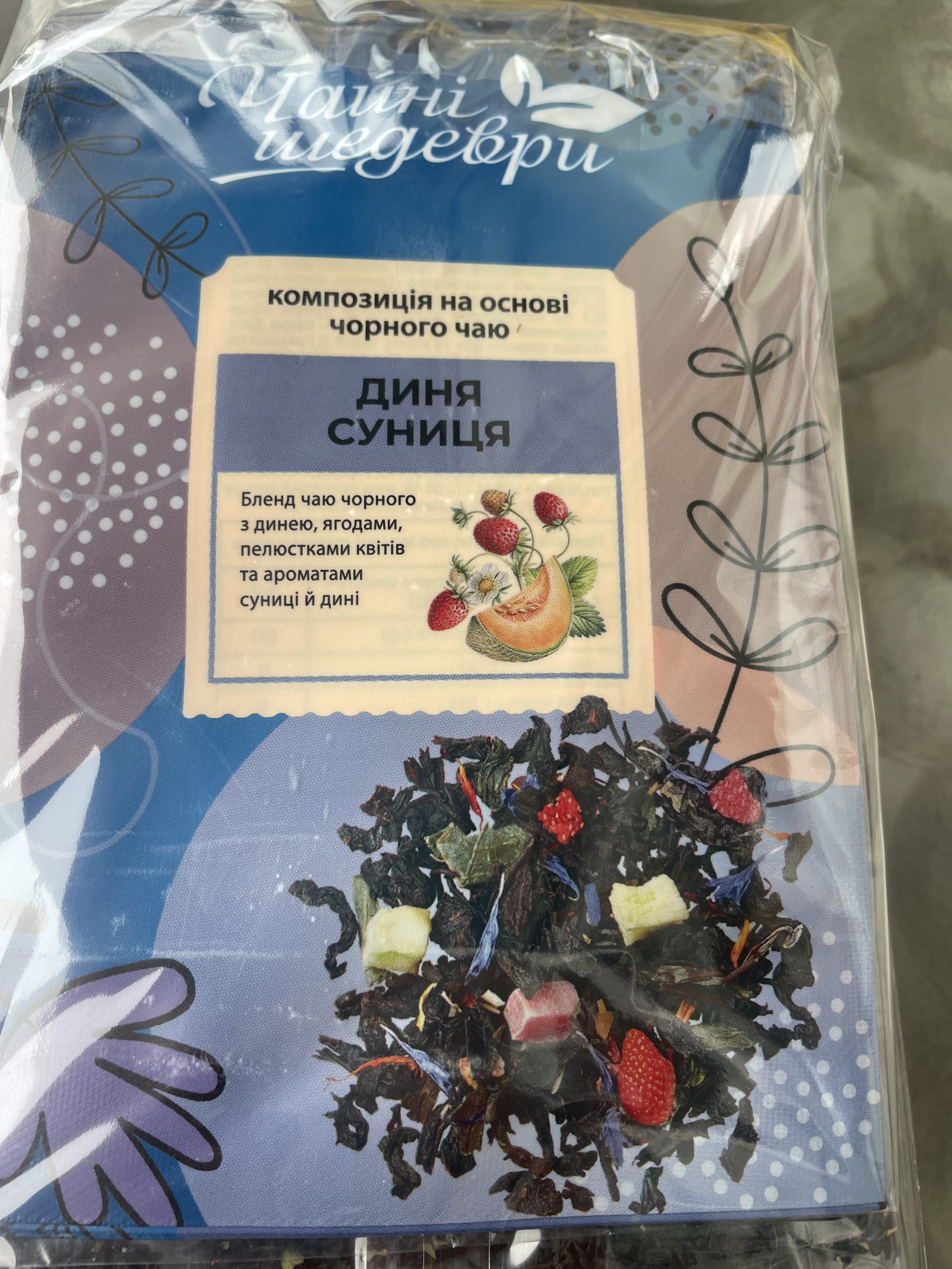 Бленд чаю чорного з динею, ягодами, пелюстками квітів та ароматами суниці і дині.